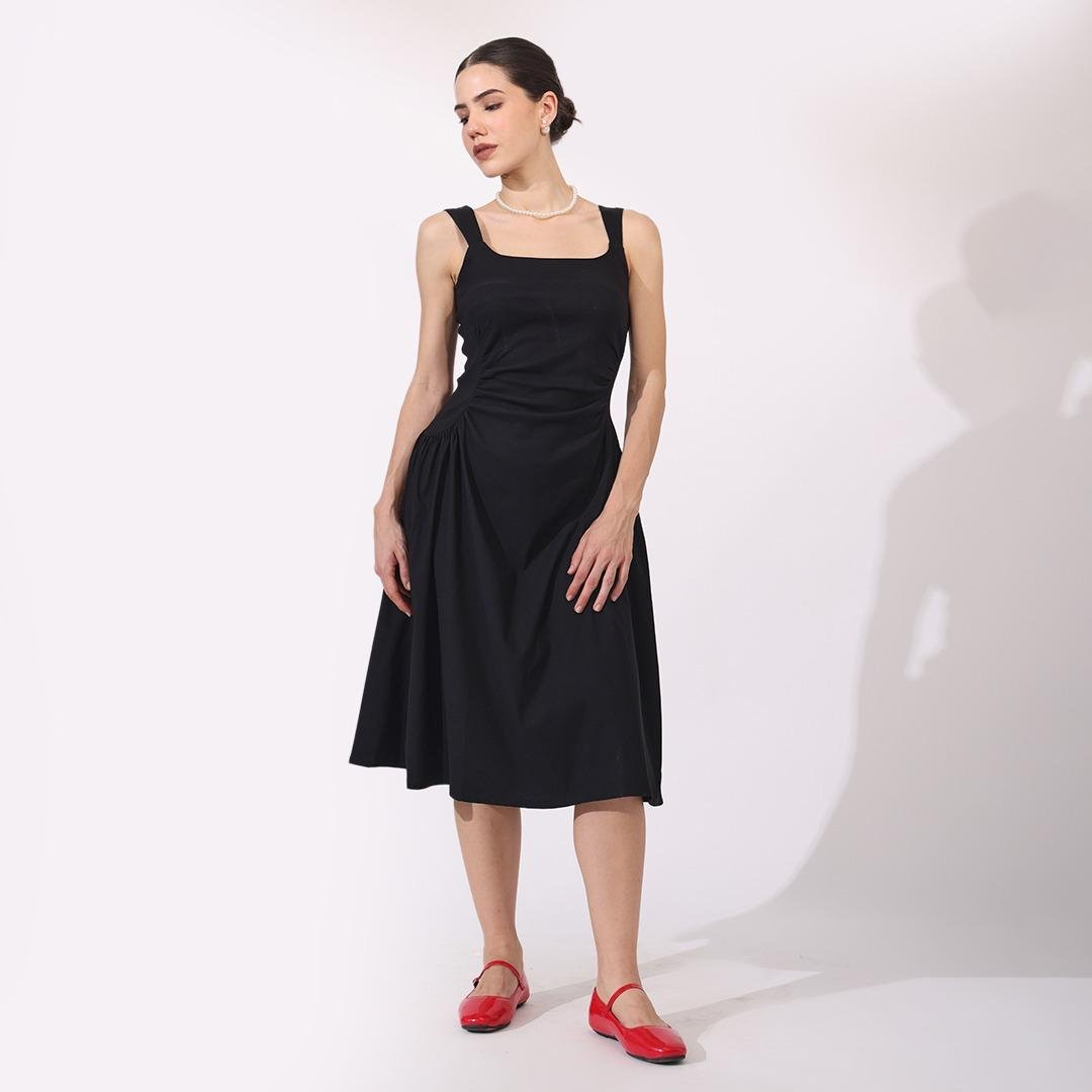 - Bodice: The dress features side-ruching or gathering at the waist, which creates a flattering, form-fitting silhouette while adding visual texture.