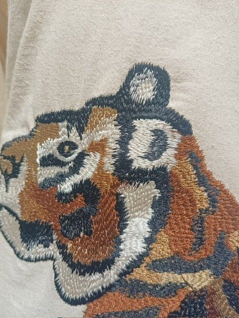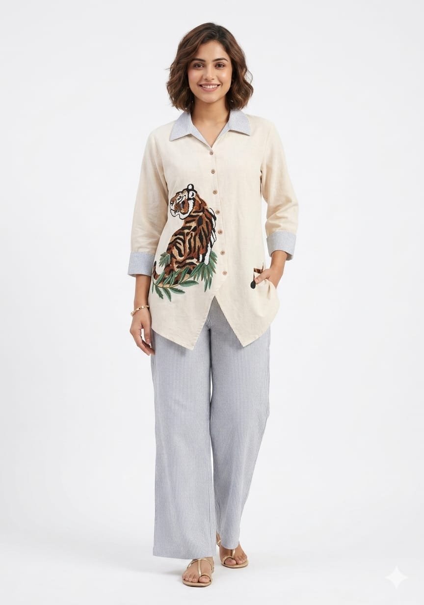 Minimalist Presentation: As shown, the look is styled with minimalist gold T-strap sandals, letting the bold tiger embroidery serve as the focal point.
