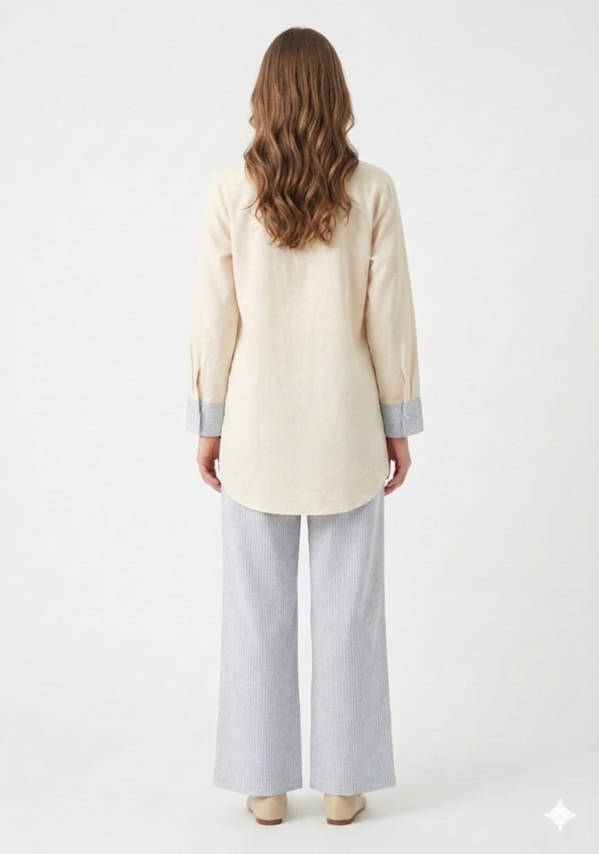 Contrasting Pinstripe Accents: The pointed shirt collar and wide cuffs are crafted from a blue-and-white vertical pinstripe fabric, providing a sharp, structured contrast to the cream base.