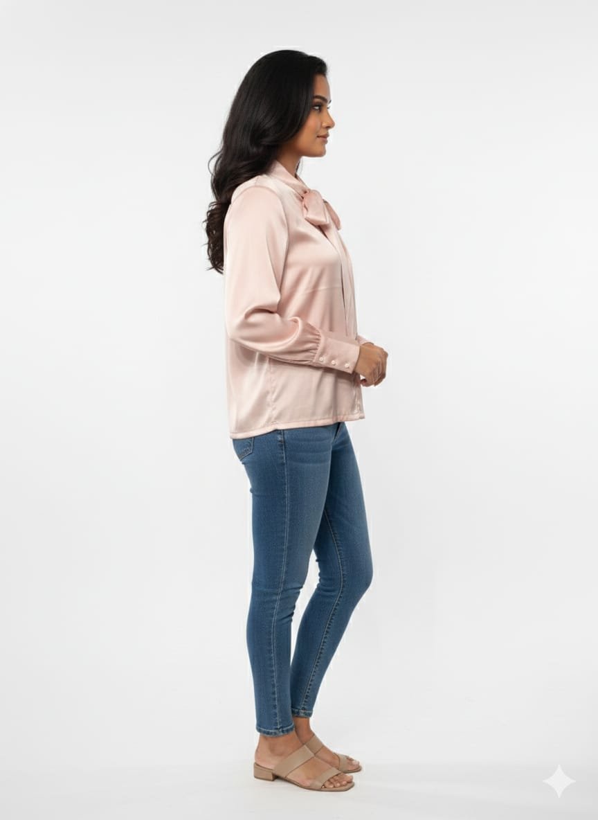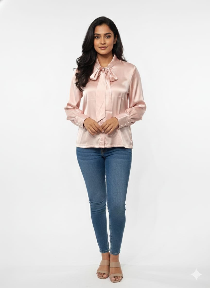 - Neckline: A high collar featuring an integrated pussy-bow tie. The tie is currently styled in a soft, centered knot with long, flowing tails.