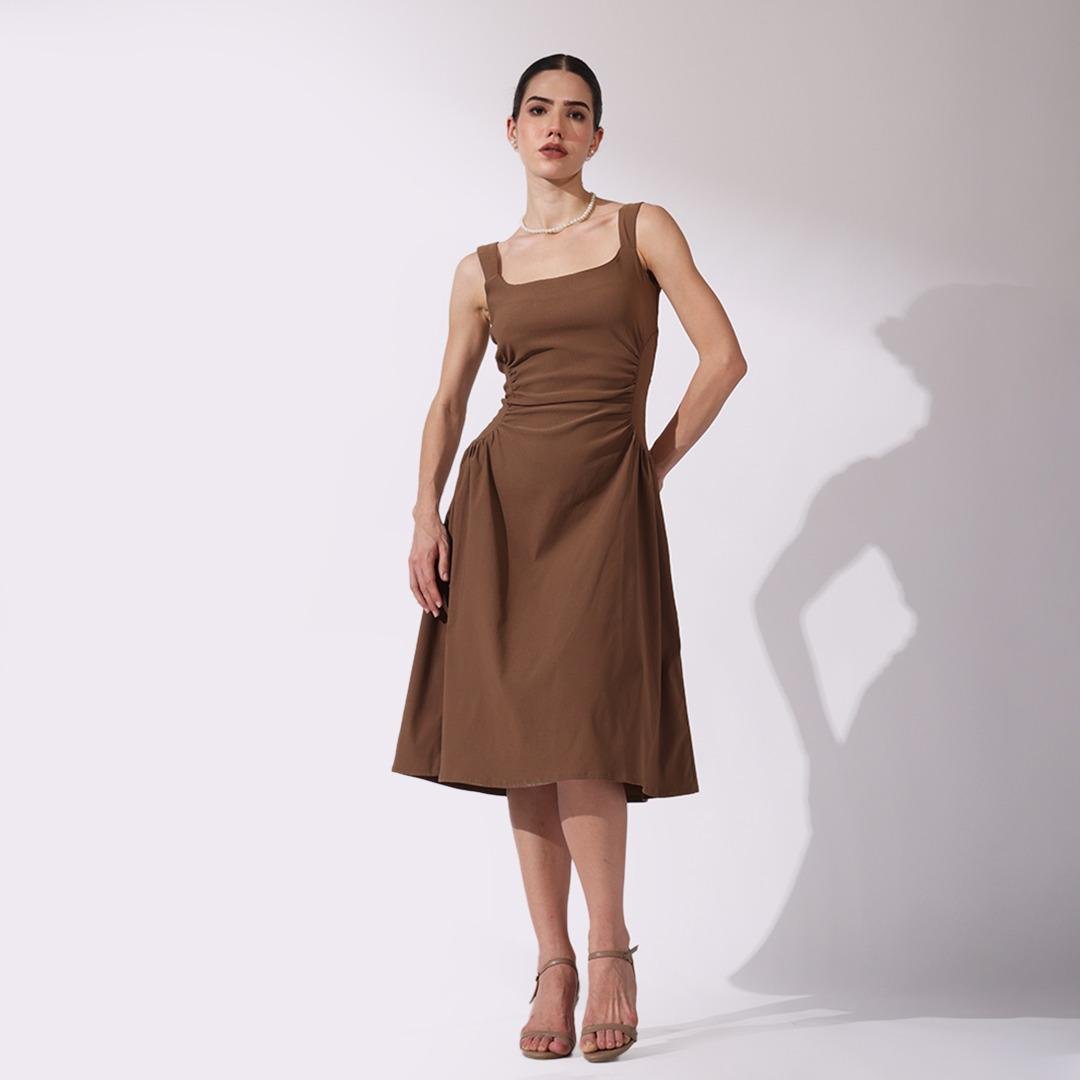 - Bodice: The dress features side-ruching or gathering at the waist, which creates a flattering, form-fitting silhouette while adding visual texture.