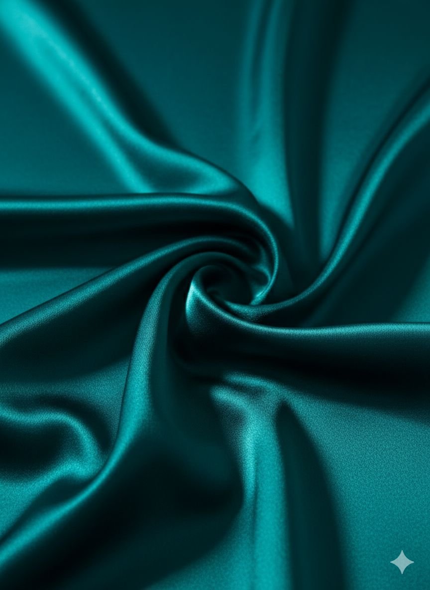 - Color & Fabric: The dress features a rich, multidimensional emerald teal hue. The fabric is a smooth, lustrous satin with a high-gloss finish that catches the light beautifully across its folds.