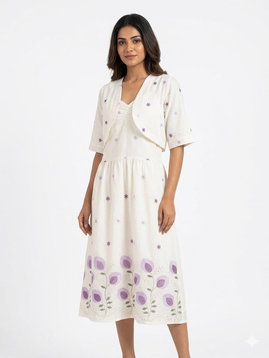 Floral Bolero & Midi Set: A fresh white two-piece dress featuring a sleeveless midi-length base with a gathered waist and a subtle sweetheart neckline. It is layered with a matching short-sleeved open bolero jacket. The set is adorned with small purple star-shaped embroidery across the bodice and jacket, while the hem of the dress features a broad border of larger purple floral motifs and delicate white scallope