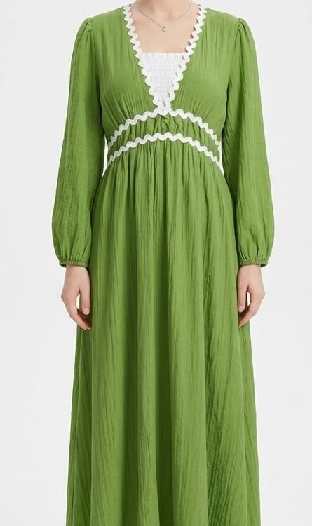 Statement Neckline: The wide, rounded scoop neckline is adorned with five oversized, circular metallic rings encrusted with sparkling crystals, creating a built-in necklace effect.