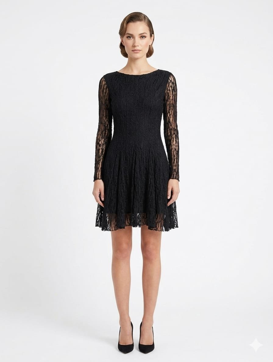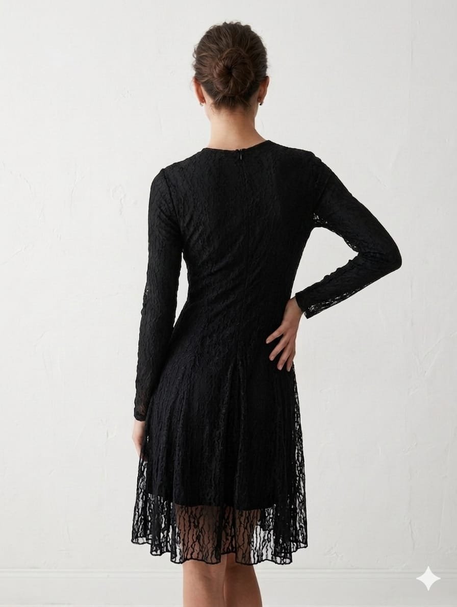 High-Contrast Glamour: The brilliance of the silver-toned crystals pops beautifully against the deep black fabric, drawing the eye to the neckline and hem.