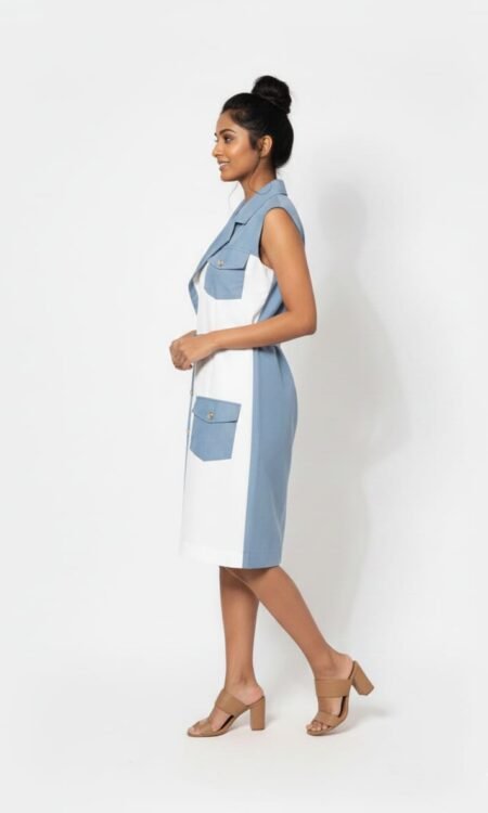 - Design: A V-neckline leads into a central cinched waist, gathered by a large, decorative jewelled brooch that creates a sunburst pleating effect across the torso.