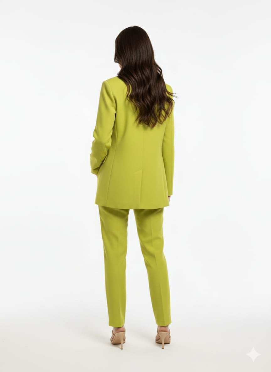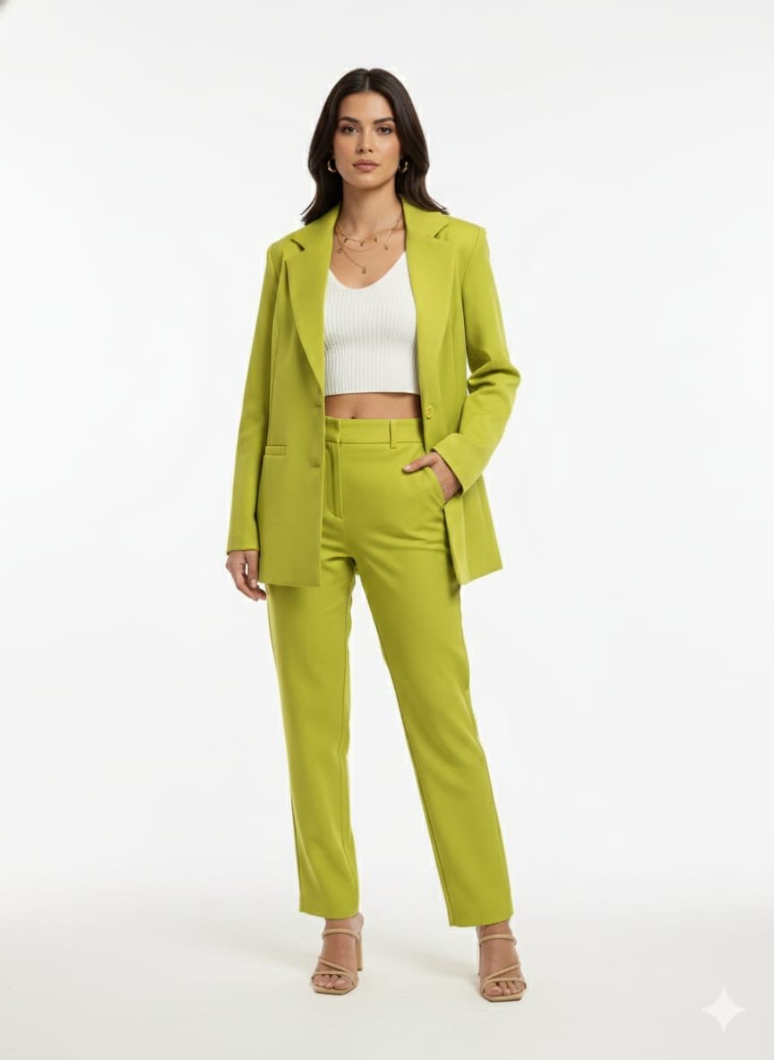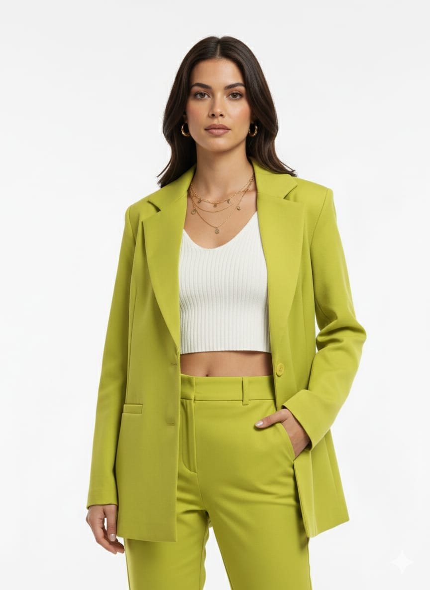 - The Blazer: A single-breasted, structured blazer in Lime Green. It features classic notched lapels and a clean, minimalist closure.
