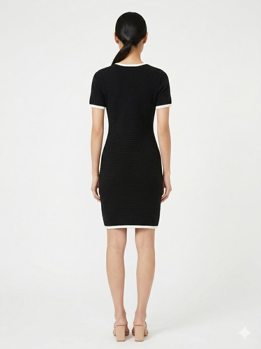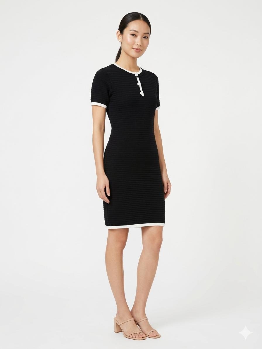 Contrast-Trim Knit Midi: This form-fitting black dress features a fine horizontal ribbed texture and short sleeves. It is defined by crisp white contrast tipping at the round neckline, cuffs, and hem, and includes a short button-front placket with three white decorative buttons.