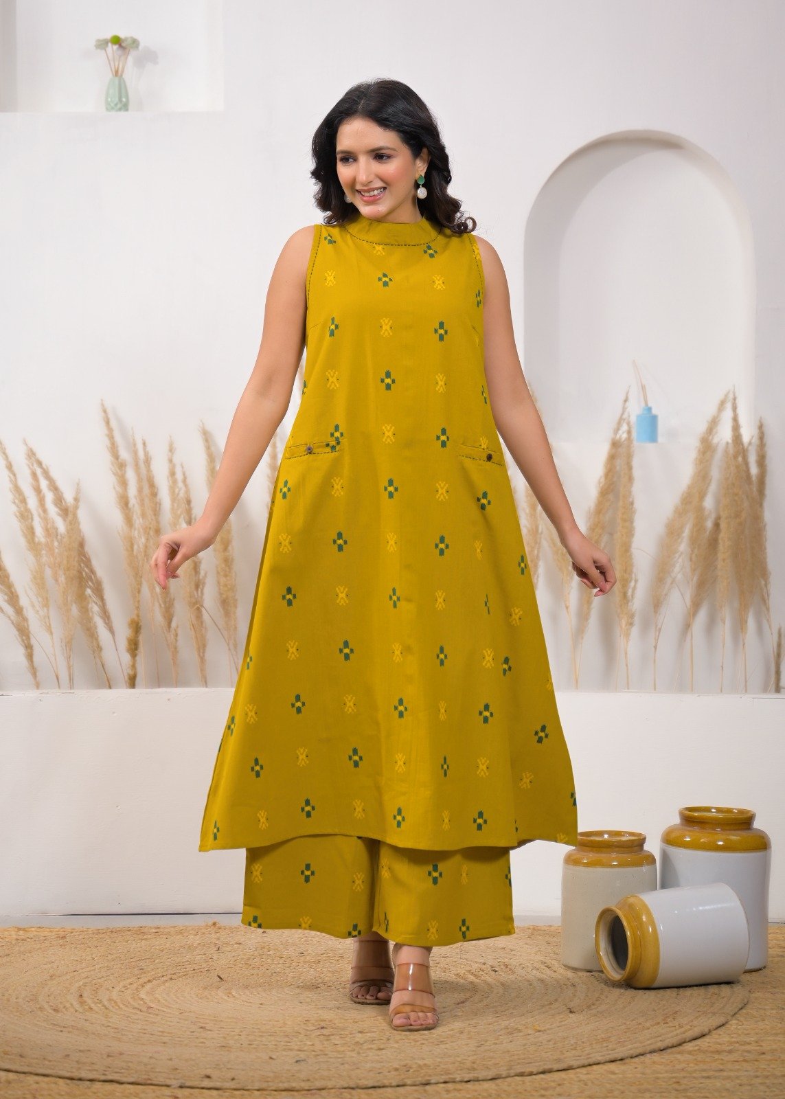 This elegant two-piece co-ord set combines traditional motifs with a contemporary silhouette, offering a blend of comfort and ethnic style. It is featured in three rich, earthy tones: Deep Navy Blue, Mustard Yellow, and Terracotta Red.