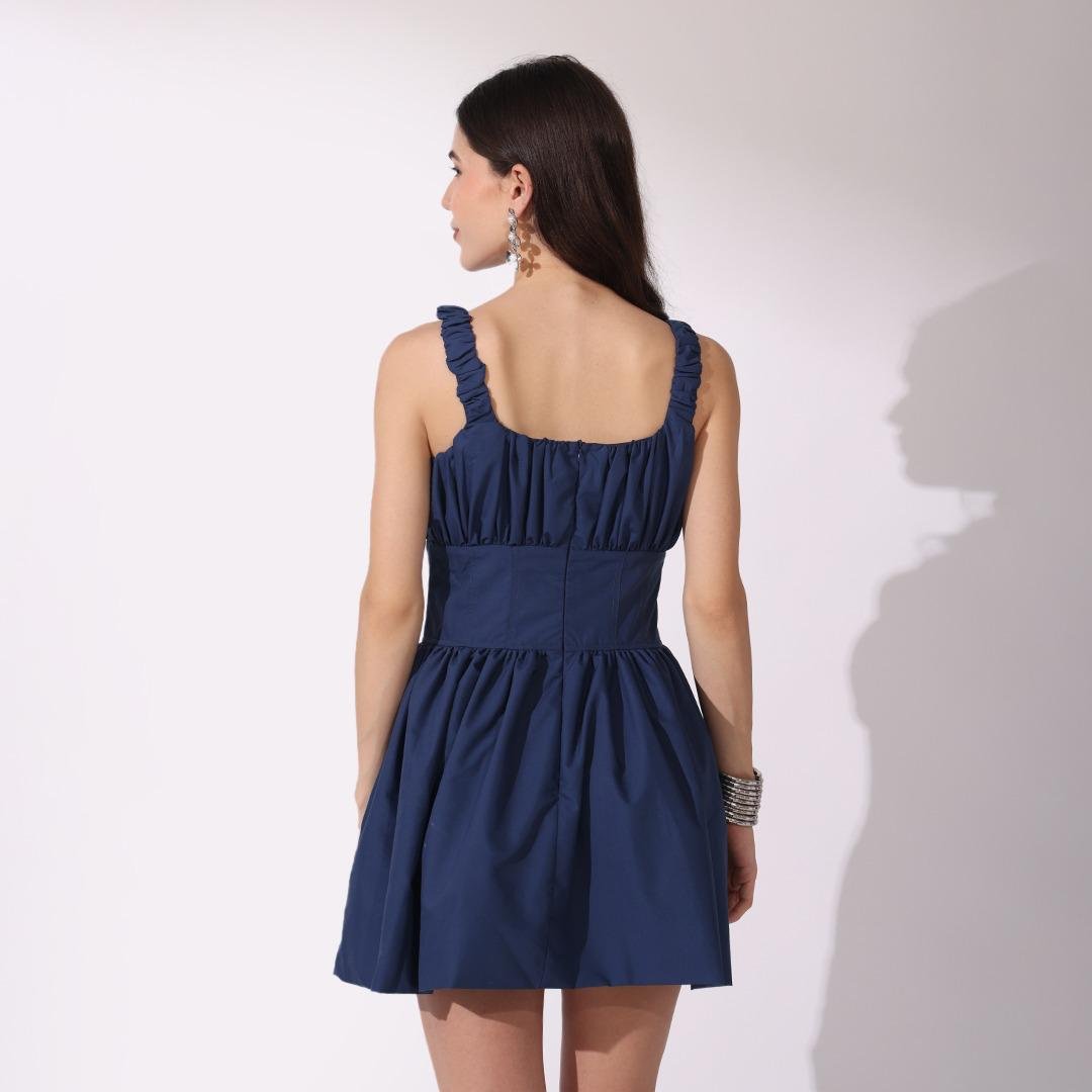 This is a navy blue, fit-and-flare mini dress that blends romantic textures with a structured, modern silhouette. It has a youthful, “babydoll” aesthetic but with a more defined waistline.
