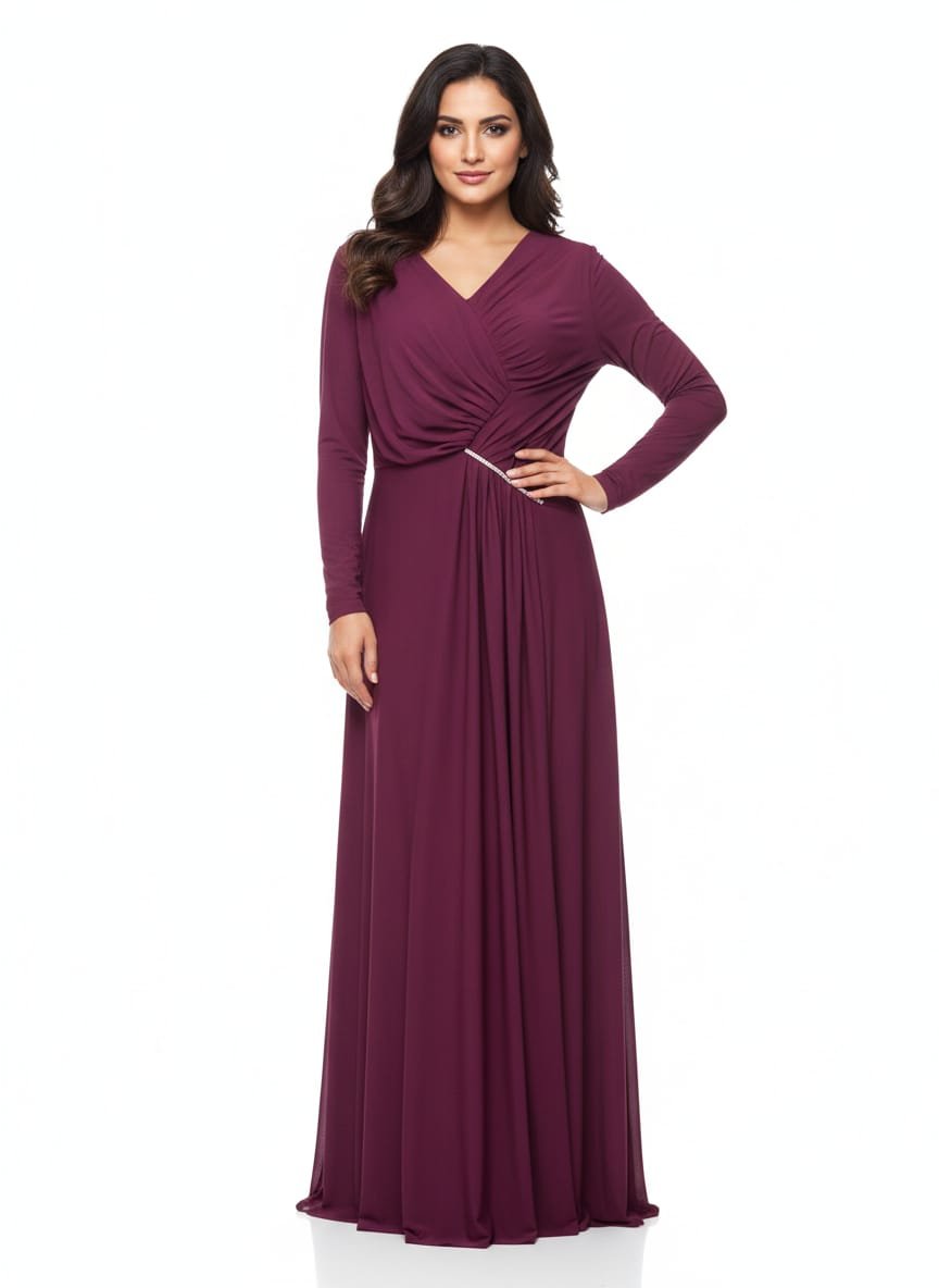- Fabric & Color: A rich, matte plum/burgundy jersey or crepe fabric that offers a smooth, fluid drape.