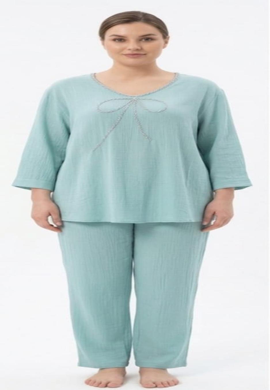 Experience the perfect blend of comfort and understated elegance. This coordinated set is crafted from a breathable, textured fabric that feels as light as air. Featuring a soft U-neckline adorned with a dainty, hand-finished bow embroidery, it’s designed for those who appreciate the finer details. The combination of the crinkle-textured fabric and the hand-beaded bow creates a beautiful interplay of light and texture.