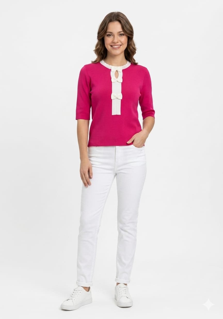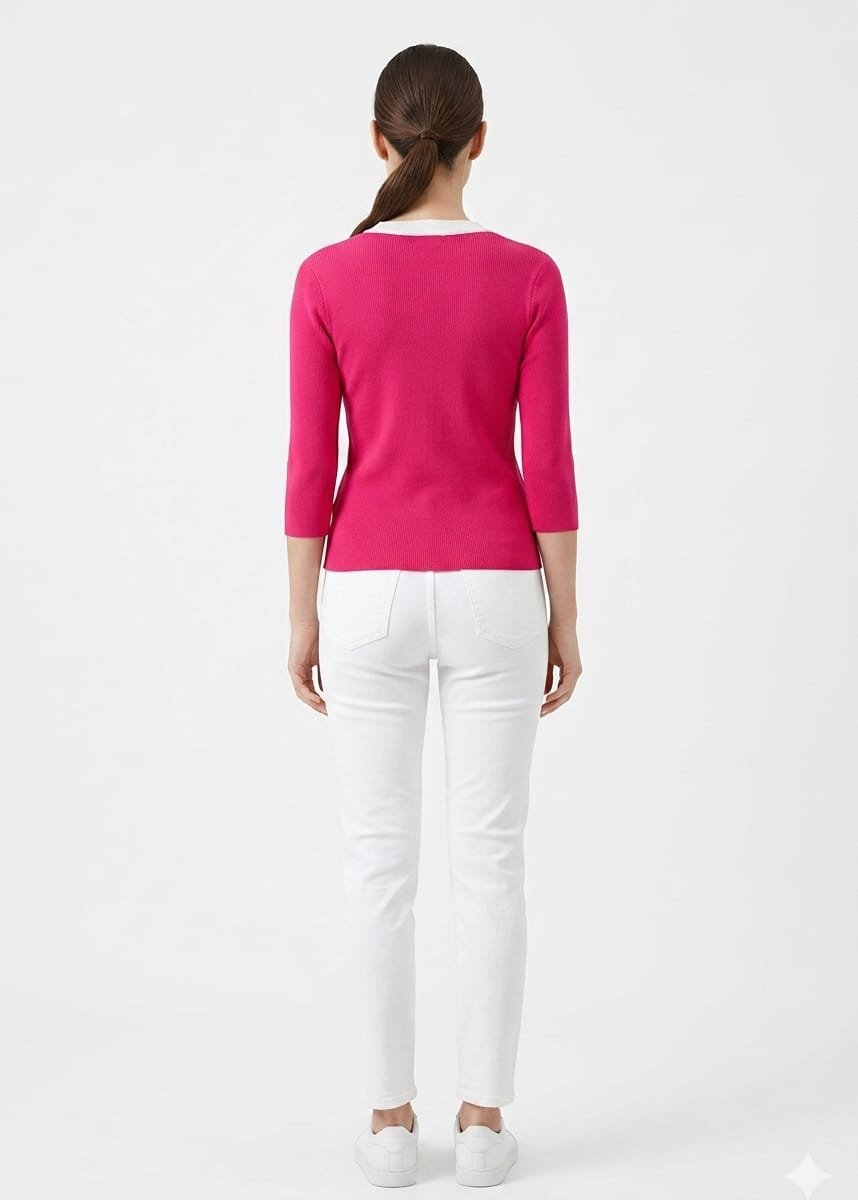 Coordinated Trim: The rounded neckline is finished with a matching white trim, providing a clean, high-contrast frame against the bright pink fabric.